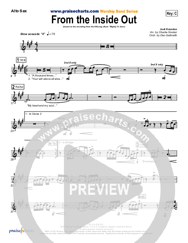 Download the AltoSax sheet music for From The Inside Out by Hillsong Worship, from the album Mighty To Save. This song was arranged by Daniel Galbraith in the key of Bb, C.
