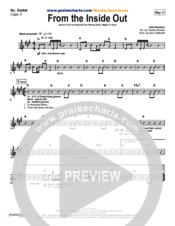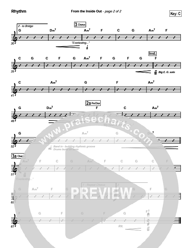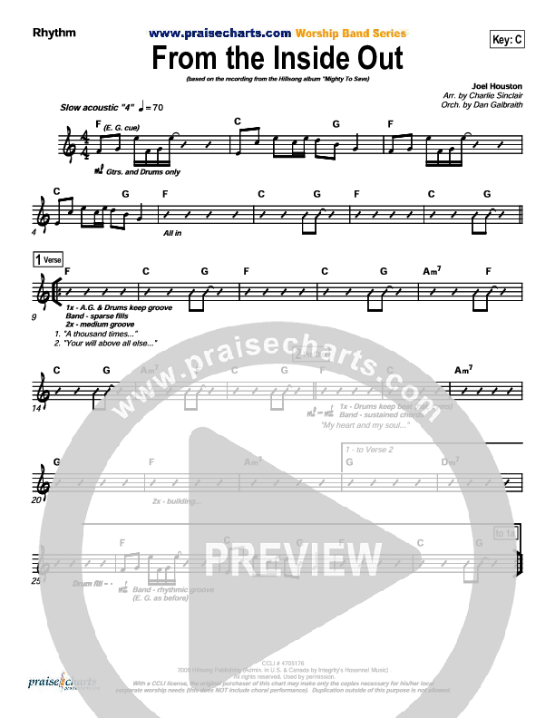 Download the Rhythm Chart for From The Inside Out by Hillsong Worship, from the album Mighty To Save. This song was arranged by Daniel Galbraith in the key of Bb, C.