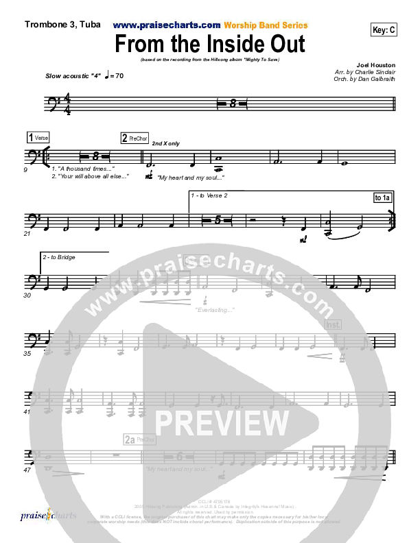Download the Trombone 3/Tuba sheet music for From The Inside Out by Hillsong Worship, from the album Mighty To Save. This song was arranged by Daniel Galbraith in the key of Bb, C.