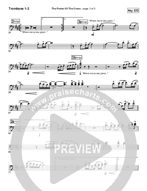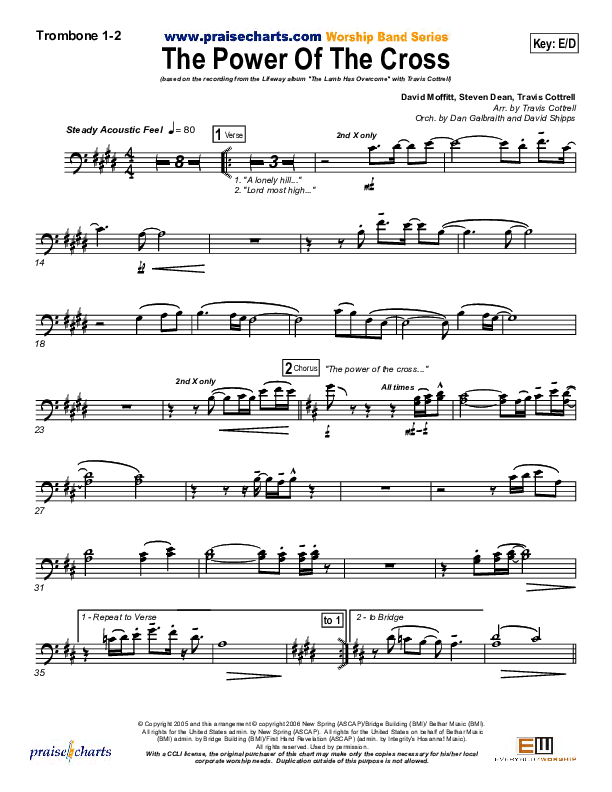Download the Trombone 1,2 sheet music for The Power Of The Cross by Travis Cottrell, from the album Living Proof Live 3 - The Lamb Has Overcome. This song was arranged by Daniel Galbraith / David Shipps in the key of E, Eb.