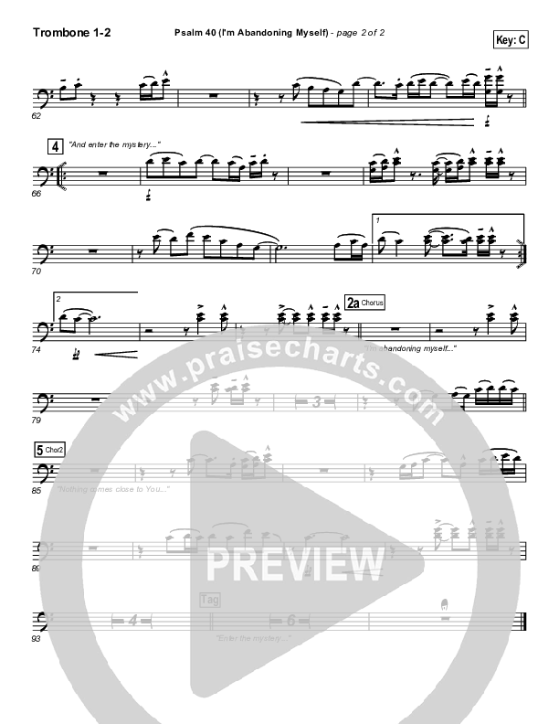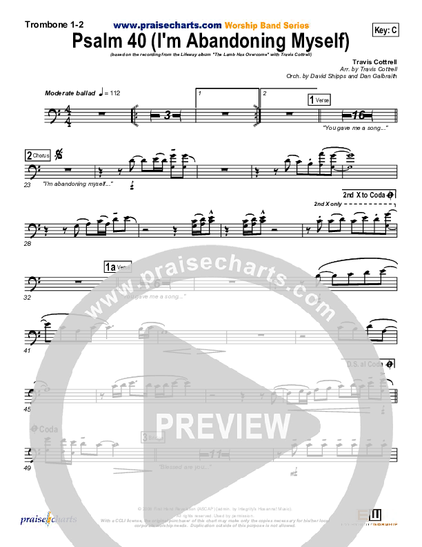 Download the Trombone 1,2 sheet music for Psalm 40 (Abandoning Myself) by Travis Cottrell, from the album Living Proof Live 3 - The Lamb Has Overcome. This song was arranged by Daniel Galbraith / David Shipps in the key of C, Db.