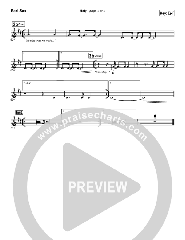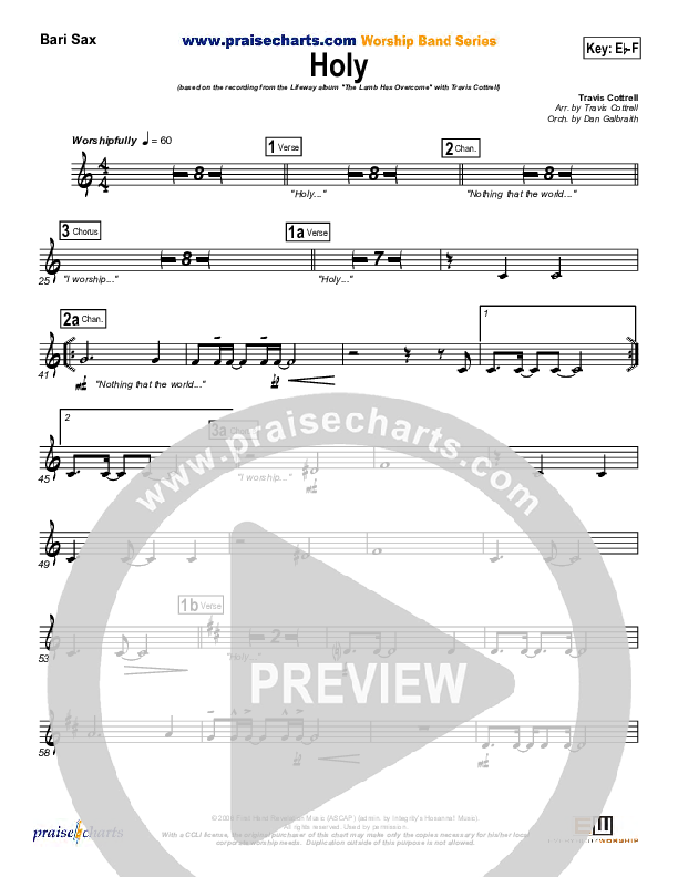 Download the Bari Sax sheet music for Holy by Travis Cottrell, from the album Living Proof Live 3 - The Lamb Has Overcome. This song was arranged by Daniel Galbraith in the key of Eb, F.