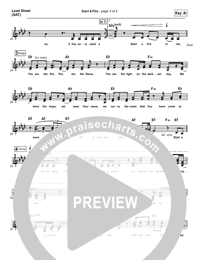Download the sheet music for Start A Fire by Unspoken, from the album Unspoken. This song was arranged by Daniel Galbraith in the key of Ab, G.