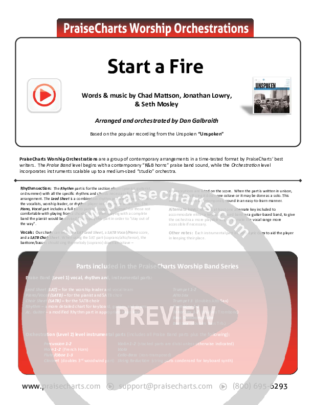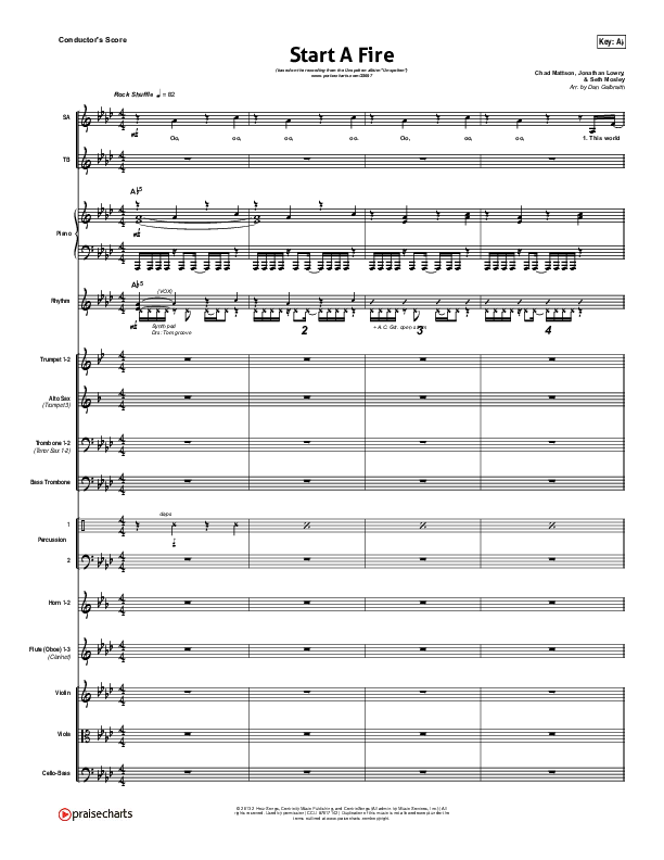 Download the Orchestration for Start A Fire by Unspoken, from the album Unspoken. This song was arranged by Daniel Galbraith in the key of Ab, G.