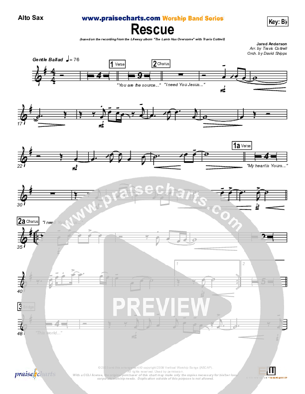 Download the AltoSax sheet music for Rescue by Travis Cottrell, from the album Living Proof Live 3 - The Lamb Has Overcome. This song was arranged by David Shipps in the key of Bb, C.