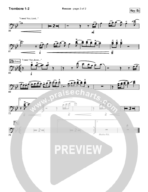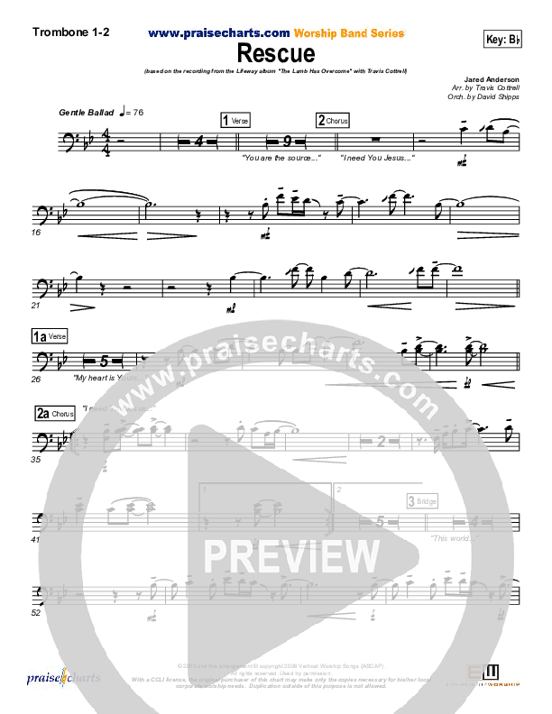 Download the Trombone 1,2 sheet music for Rescue by Travis Cottrell, from the album Living Proof Live 3 - The Lamb Has Overcome. This song was arranged by David Shipps in the key of Bb, C.