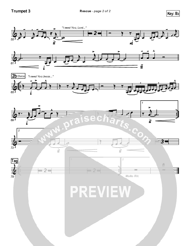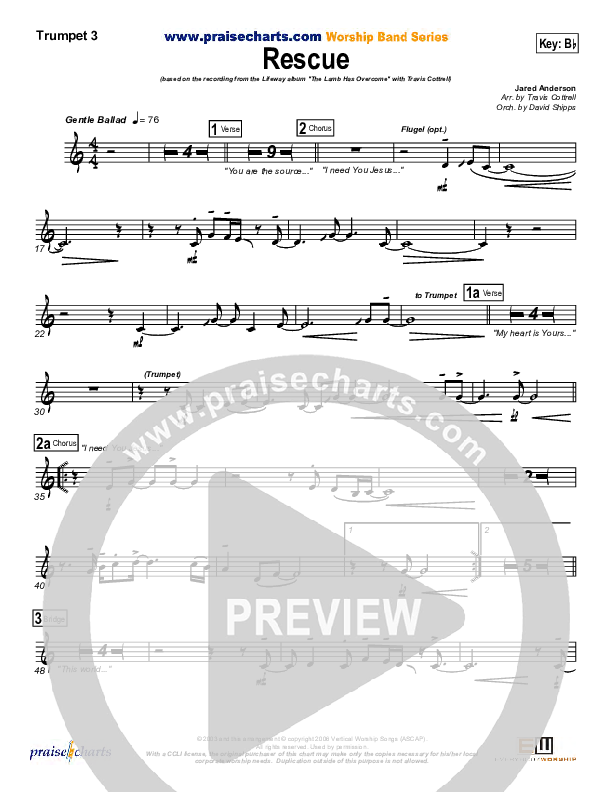 Download the Trumpet 3 sheet music for Rescue by Travis Cottrell, from the album Living Proof Live 3 - The Lamb Has Overcome. This song was arranged by David Shipps in the key of Bb, C.