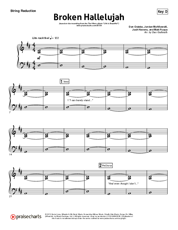 Download the Orchestration for Broken Hallelujah by The Afters, from the album Life Is Beautiful. This song was arranged by Daniel Galbraith in the key of C, D.