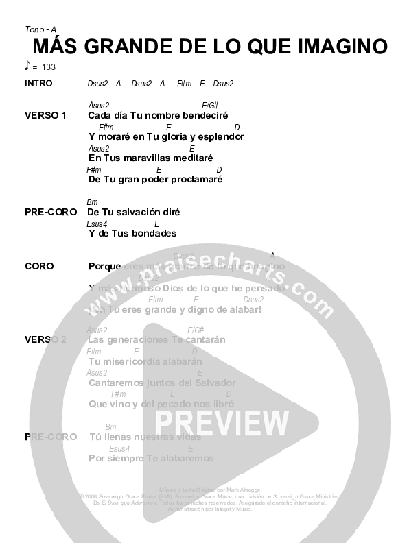 Download the PDF Chord Charts for Mas Grande De Lo Que Imagino (Greater Than We Can Imagine) by Sovereign Grace, from the album El Dios Que Adoramos.