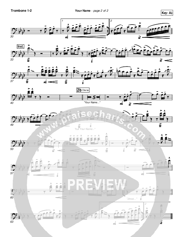 Download the Trombone 1,2 sheet music for Your Name by New Life Worship, from the album My Savior Lives. This song was arranged by John Wasson in the key of Ab, B, Bb.