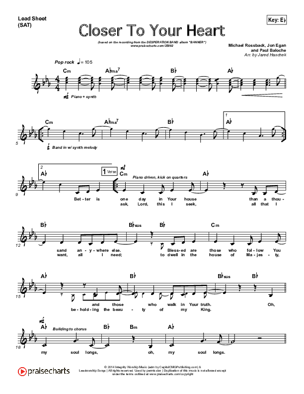 Download the sheet music for Closer To Your Heart by Desperation Band / Bri Giles, from the album Banner. This song was arranged by Jared Haschek in the key of E, Eb.
