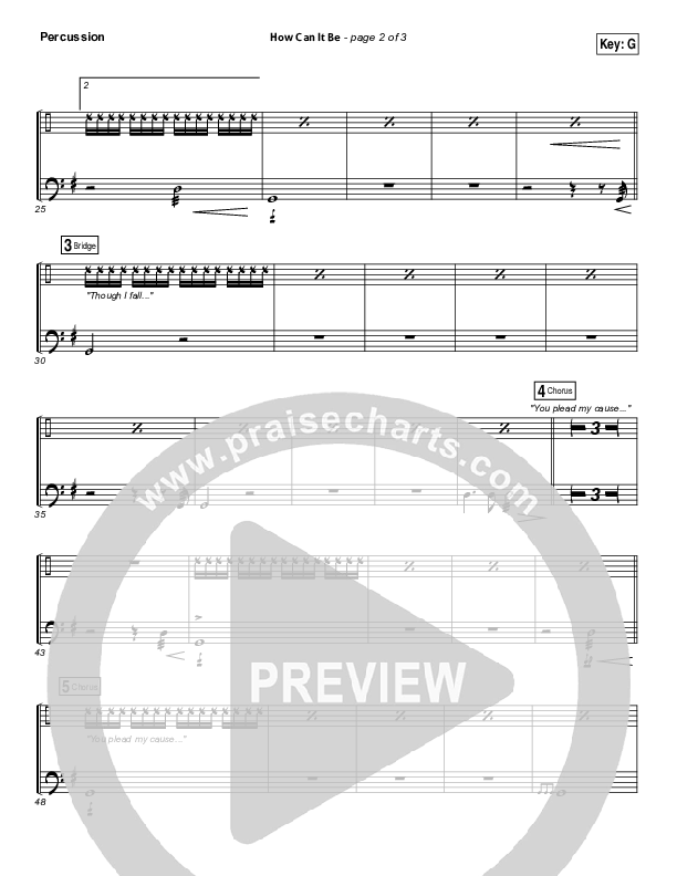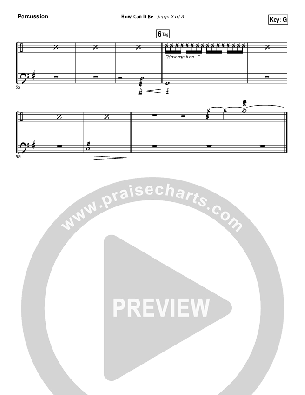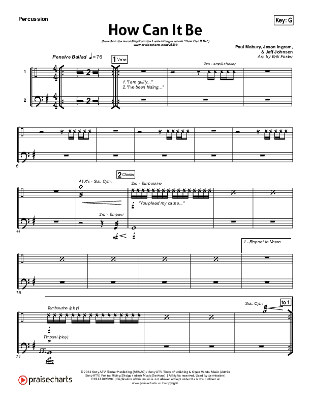Download the percussion sheet music for How Can It Be by Lauren Daigle, from the album How Can It Be. This song was arranged by Daniel Galbraith in the key of A, Ab, Eb, F, G, Gb.