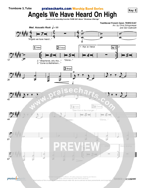 Download the Trombone 3/Tuba sheet music for Angels We Have Heard On High by Third Day, from the album Christmas Offerings. This song was arranged by Chris Schopmeyer / Daniel Galbraith in the key of E, F.