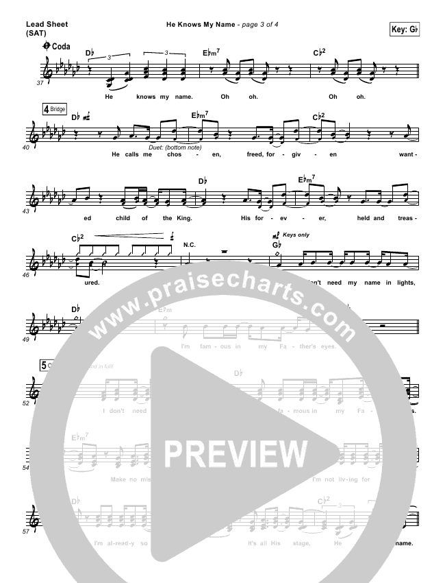 Download the sheet music for He Knows My Name by Francesca Battistelli, from the album If We're Honest. This song was arranged by Daniel Galbraith / Erik Foster in the key of G, Gb.