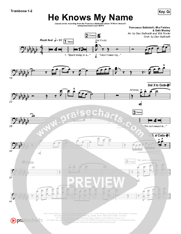 Download the Trombone 1,2 sheet music for He Knows My Name by Francesca Battistelli, from the album If We're Honest. This song was arranged by Daniel Galbraith / Erik Foster in the key of G, Gb.