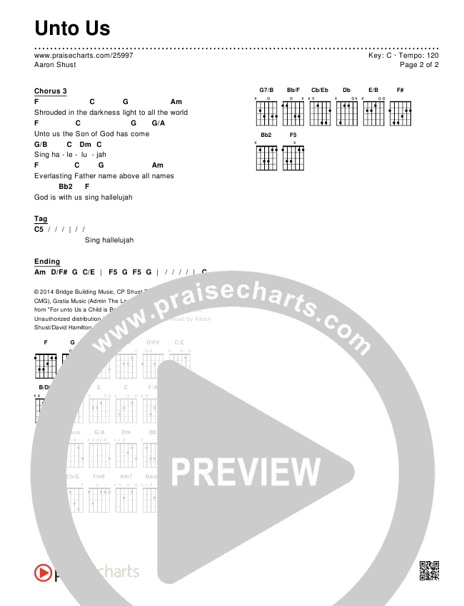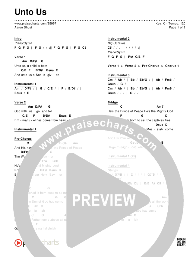 Download the PDF Chord Charts for Unto Us by Aaron Shust, from the album Unto Us. This song was arranged by Daniel Galbraith / Lee Marcum in the key of Bb.