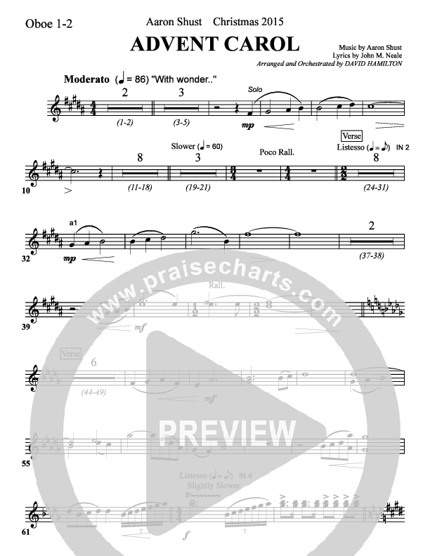 Download the Orchestration for Advent Carol by Aaron Shust, from the album Unto Us. This song was arranged by David Hamilton / Lee Marcum in the key of B.