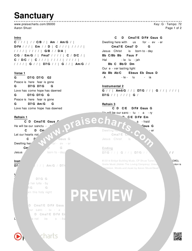 Download the PDF Chord Charts for Sanctuary by Aaron Shust, from the album Unto Us. This song was arranged by David Hamilton in the key of G.