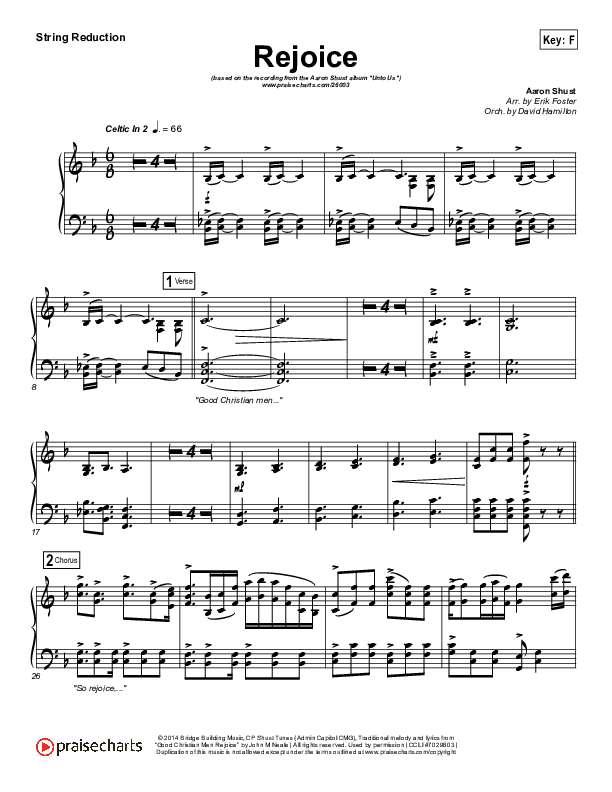 Download the Orchestration for Rejoice by Aaron Shust, from the album Unto Us. This song was arranged by David Hamilton in the key of F.