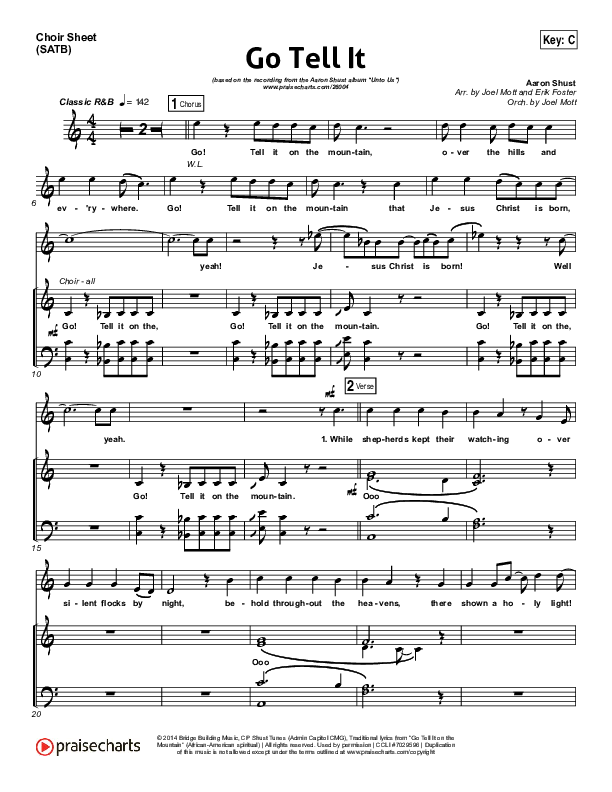 Download the Choir Sheet for Go Tell It by Aaron Shust, from the album Unto Us. This song was arranged by Joel Mott / Erik Foster in the key of Bb.