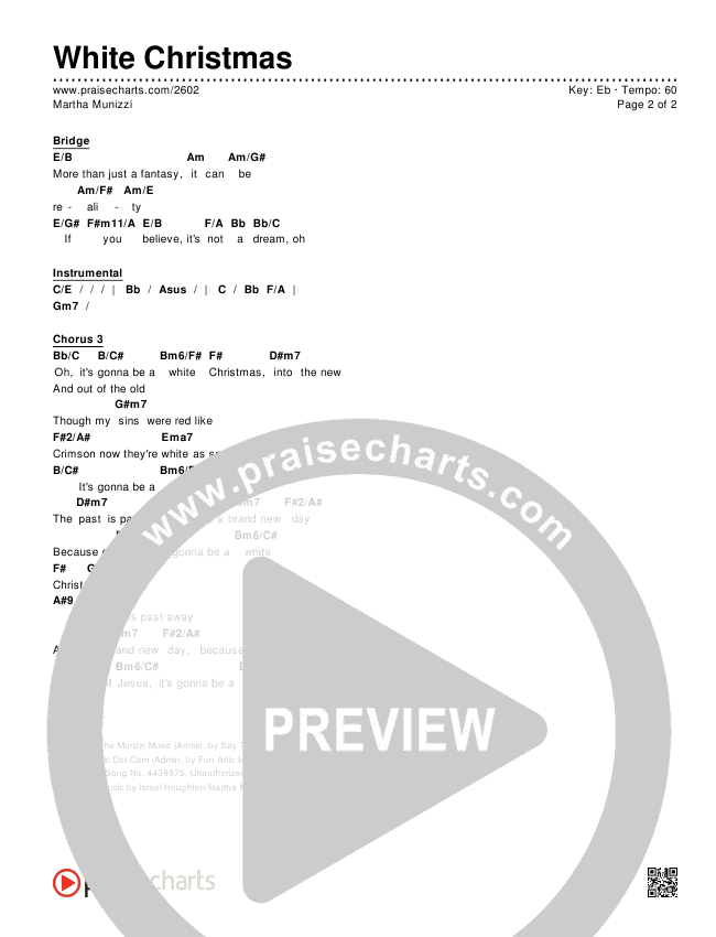 Download the PDF Chord Charts for White Christmas by Martha Munizzi, from the album When He Came. This song was arranged by Munizzi Music in the key of Eb.