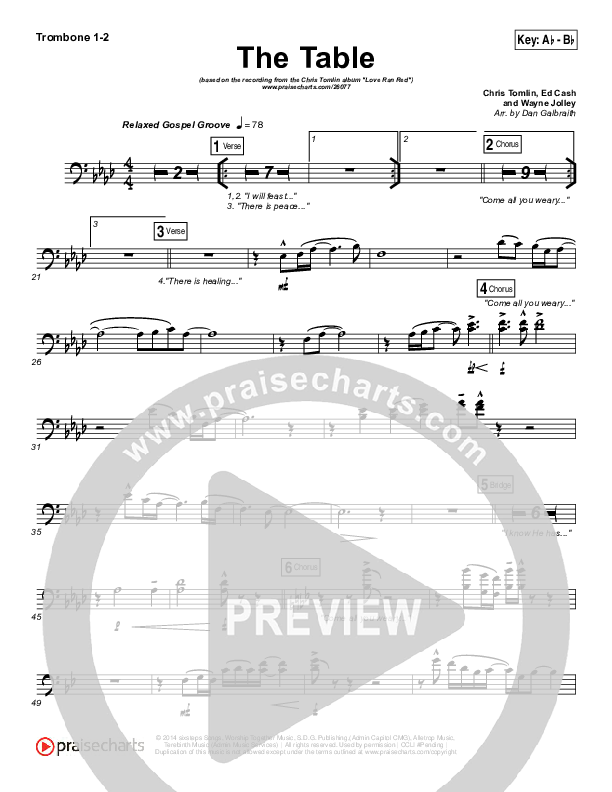 Download the Trombone 1,2 sheet music for The Table by Chris Tomlin, from the album Love Ran Red. This song was arranged by Daniel Galbraith / Shane Ohlson in the key of Ab, F, G.