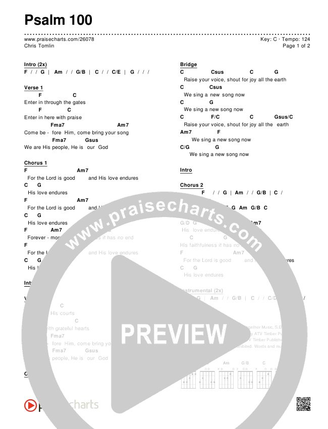 Download the PDF Chord Charts for Psalm 100 by Chris Tomlin, from the album Love Ran Red. This song was arranged by Joel Mott in the key of A, Bb, C.