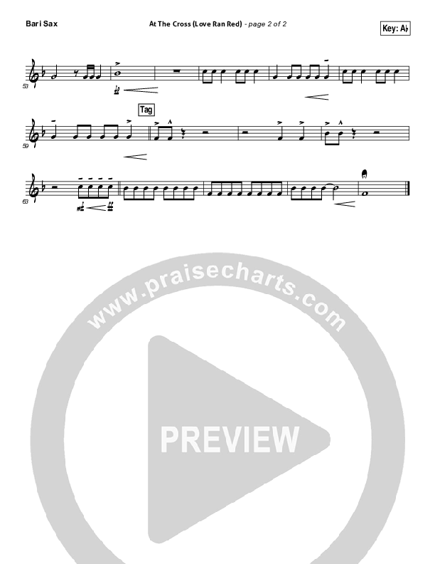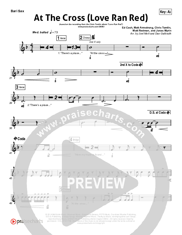 Download the Bari Sax sheet music for At The Cross (Love Ran Red) by Chris Tomlin, from the album Love Ran Red. This song was arranged by Joel Mott in the key of Ab, E, F, G, Gb.