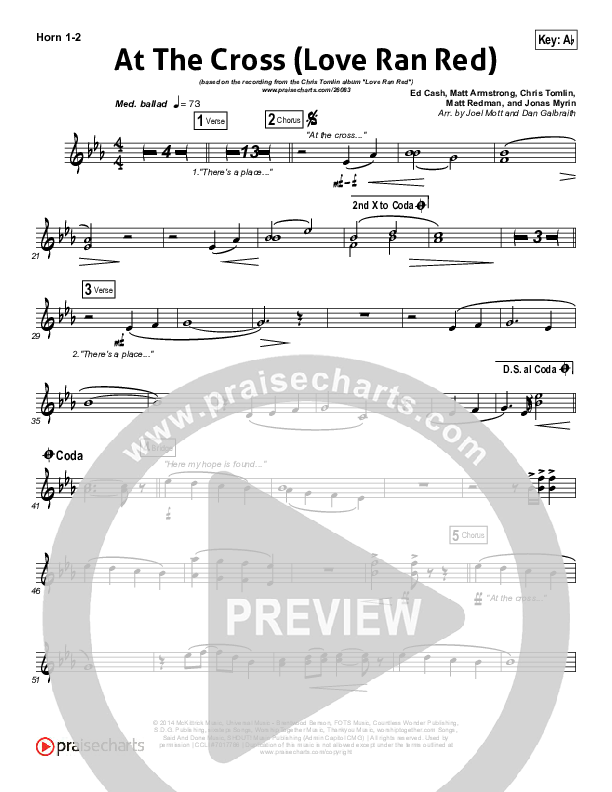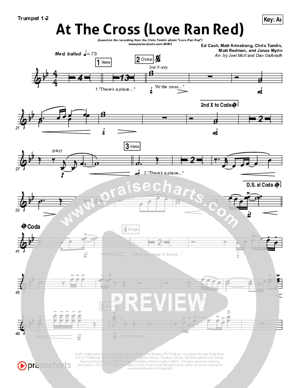 Download the Orchestration brass parts for At The Cross (Love Ran Red) by Chris Tomlin, from the album Love Ran Red. This song was arranged by Joel Mott in the key of Ab, E, F, G, Gb.