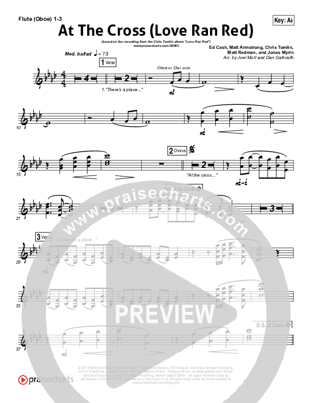 Download the Flute/Oboe sheet music for At The Cross (Love Ran Red) by Chris Tomlin, from the album Love Ran Red. This song was arranged by Joel Mott in the key of Ab, E, F, G, Gb.