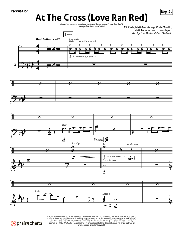 Download the percussion sheet music for At The Cross (Love Ran Red) by Chris Tomlin, from the album Love Ran Red. This song was arranged by Joel Mott in the key of Ab, E, F, G, Gb.