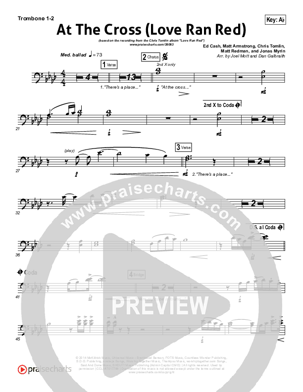 Download the Trombone 1,2 sheet music for At The Cross (Love Ran Red) by Chris Tomlin, from the album Love Ran Red. This song was arranged by Joel Mott in the key of Ab, E, F, G, Gb.
