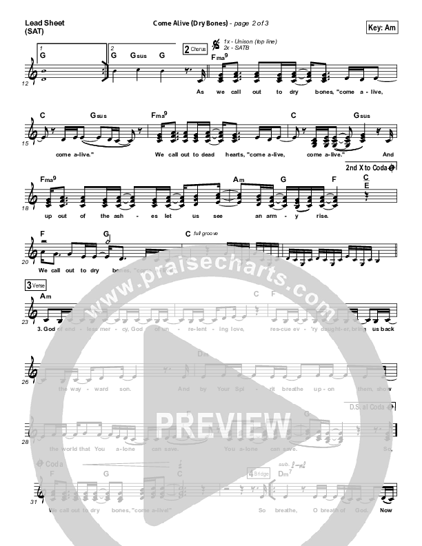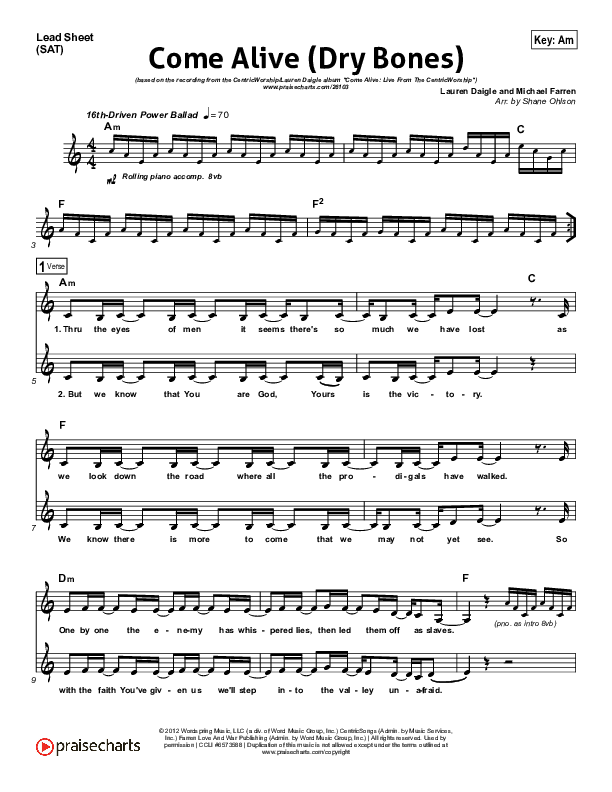 Download the sheet music for Come Alive (Dry Bones) by Centricity Worship / Lauren Daigle, from the album Come Alive: Live From The CentricWorship Retreat. This song was arranged by Shane Ohlson in the key of Am.