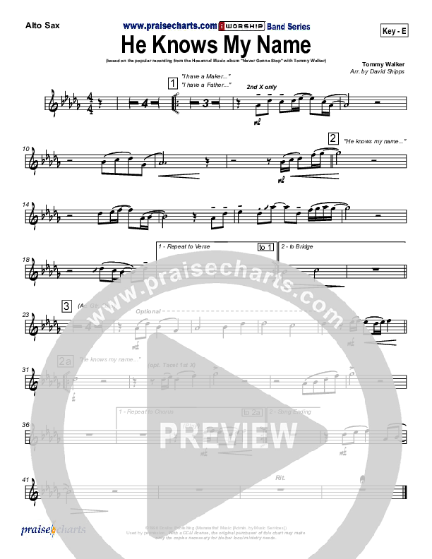 Download the AltoSax sheet music for He Knows My Name by Tommy Walker, from the album Never Gonna Stop. This song was arranged by David Shipps in the key of E, F.
