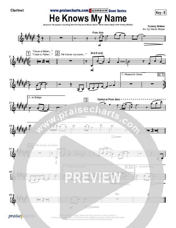 Download the Orchestration for He Knows My Name by Tommy Walker, from the album Never Gonna Stop. This song was arranged by David Shipps in the key of E, F.