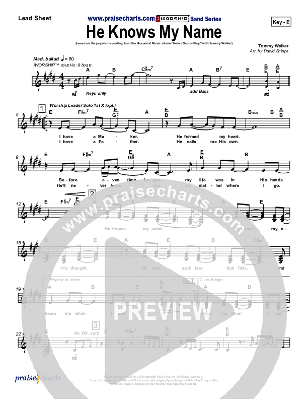Download the sheet music for He Knows My Name by Tommy Walker, from the album Never Gonna Stop. This song was arranged by David Shipps in the key of E, F.