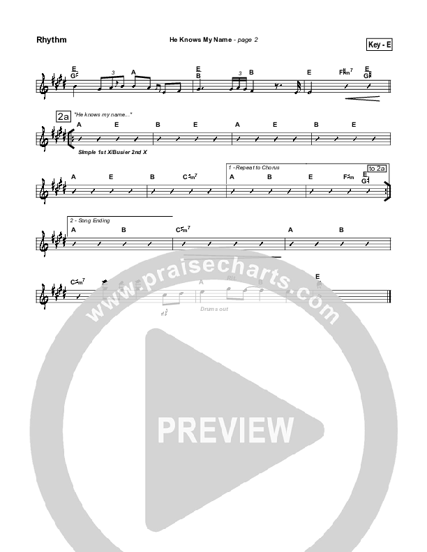 Download the Rhythm Chart for He Knows My Name by Tommy Walker, from the album Never Gonna Stop. This song was arranged by David Shipps in the key of E, F.