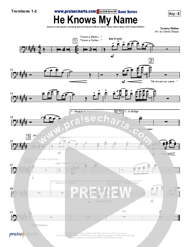 Download the Trombone 1,2 sheet music for He Knows My Name by Tommy Walker, from the album Never Gonna Stop. This song was arranged by David Shipps in the key of E, F.
