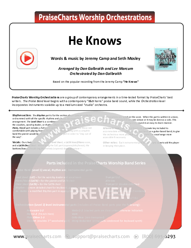 Download the Orchestration for He Knows by Jeremy Camp, from the album He Knows. This song was arranged by Daniel Galbraith / Lee Marcum in the key of D, E.