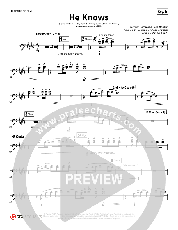 Download the Trombone 1,2 sheet music for He Knows by Jeremy Camp, from the album He Knows. This song was arranged by Daniel Galbraith / Lee Marcum in the key of D, E.