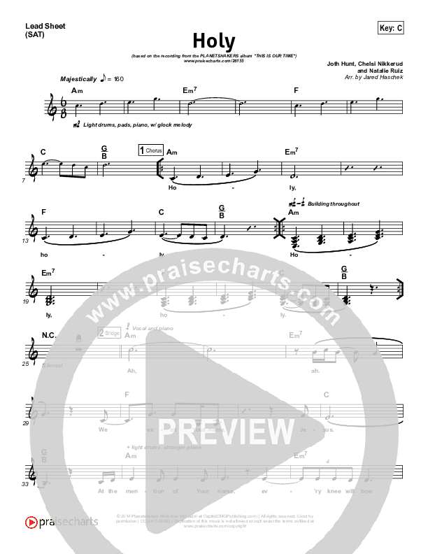 Download the sheet music for Holy by Planetshakers, from the album This Is Our Time. This song was arranged by Jared Haschek in the key of C, D.