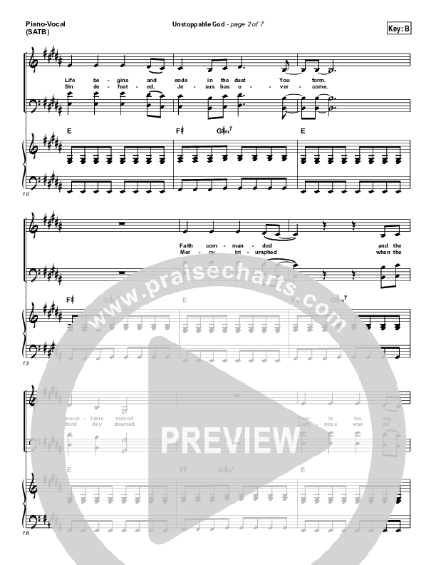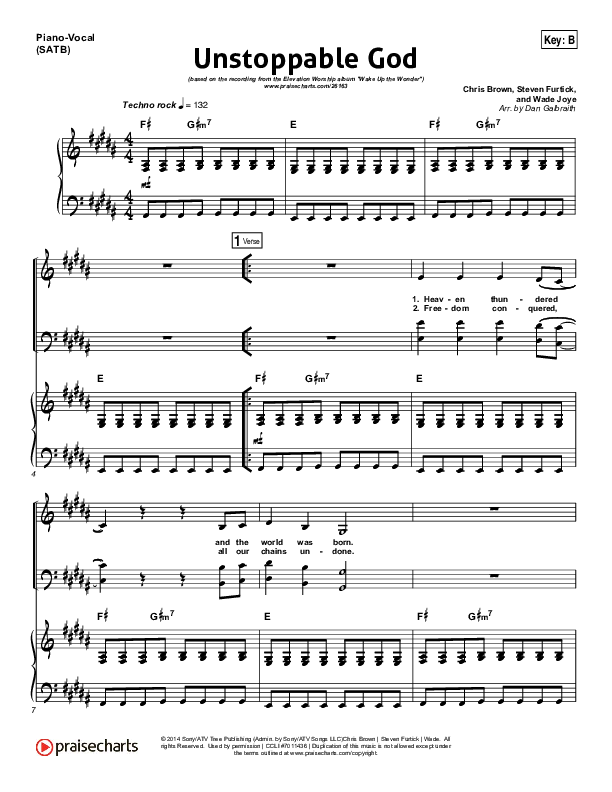 Download the sheet music for Unstoppable God by Elevation Worship, from the album Wake Up The Wonder. This song was arranged by Daniel Galbraith / Dave Iula in the key of A, B, Bb, C, G.