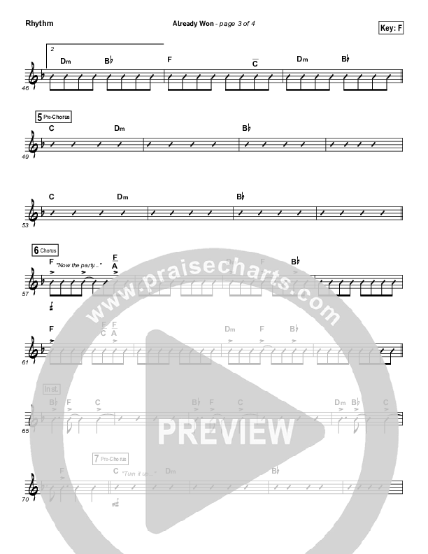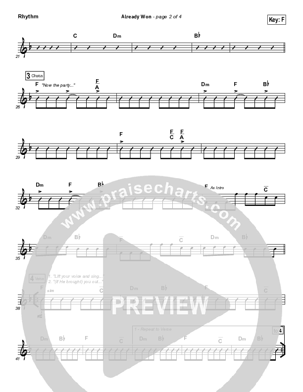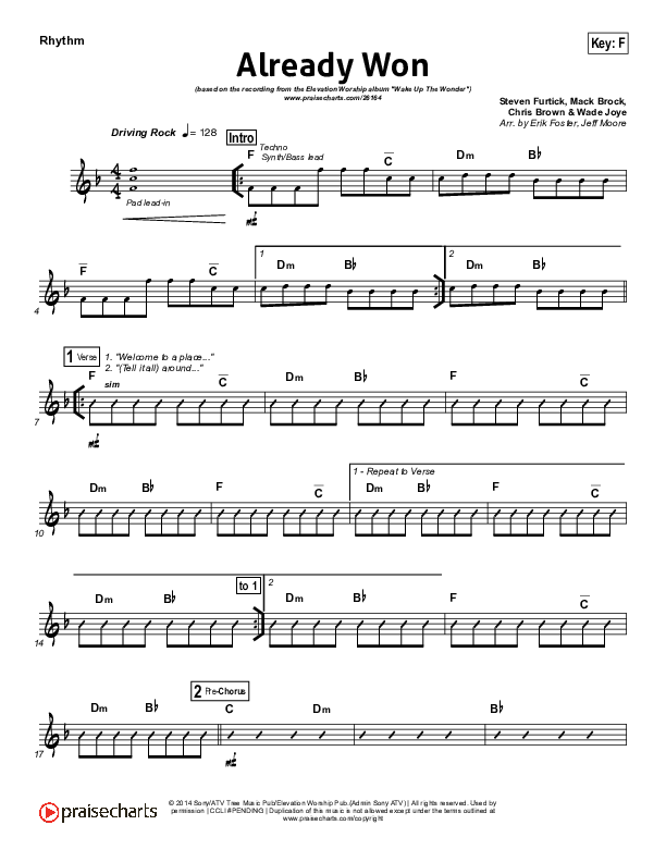 Download the Rhythm Chart for Already Won by Elevation Worship, from the album Wake Up The Wonder. This song was arranged by Jeff Moore / Erik Foster in the key of E, F.