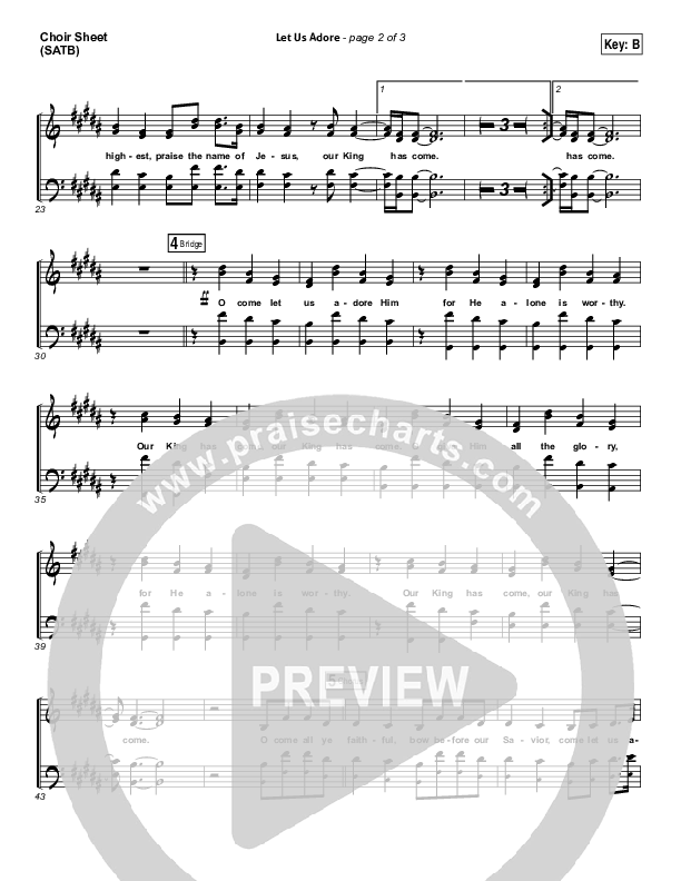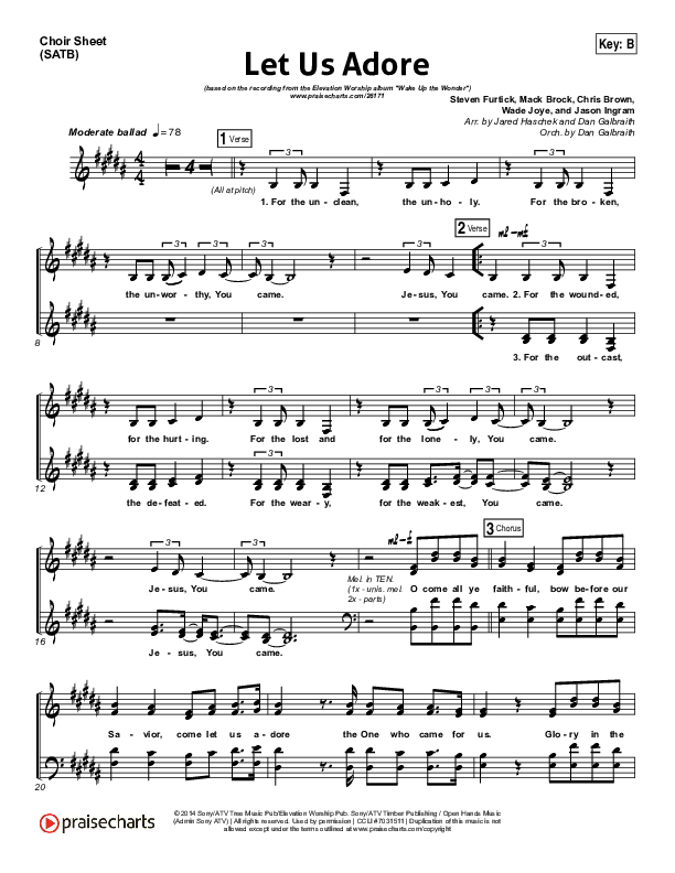 Download the Choir Sheet for Let Us Adore by Elevation Worship, from the album Wake Up The Wonder. This song was arranged by Jared Haschek / Daniel Galbraith in the key of B, Bb, D.
