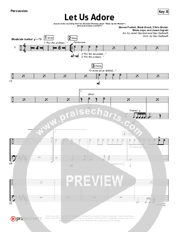 Download the percussion sheet music for Let Us Adore by Elevation Worship, from the album Wake Up The Wonder. This song was arranged by Jared Haschek / Daniel Galbraith in the key of B, Bb, D.