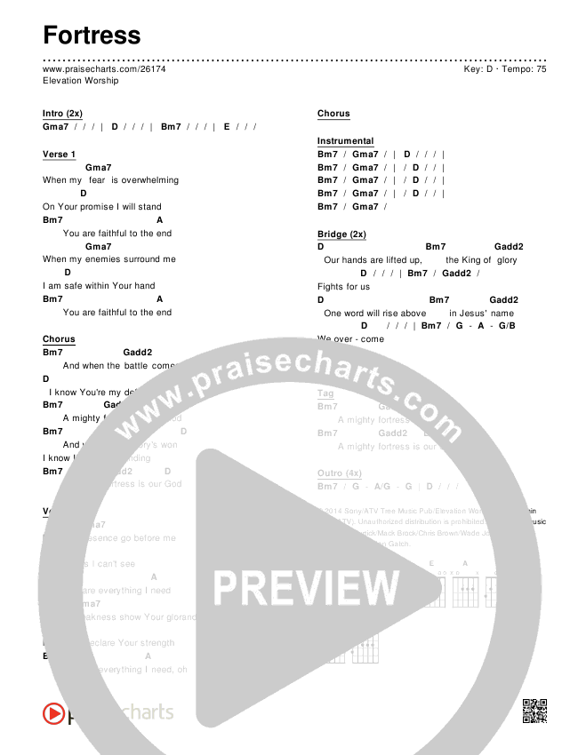 Download the PDF Chord Charts for Fortress by Elevation Worship, from the album Wake Up The Wonder. This song was arranged by Dave Iula in the key of C, D.