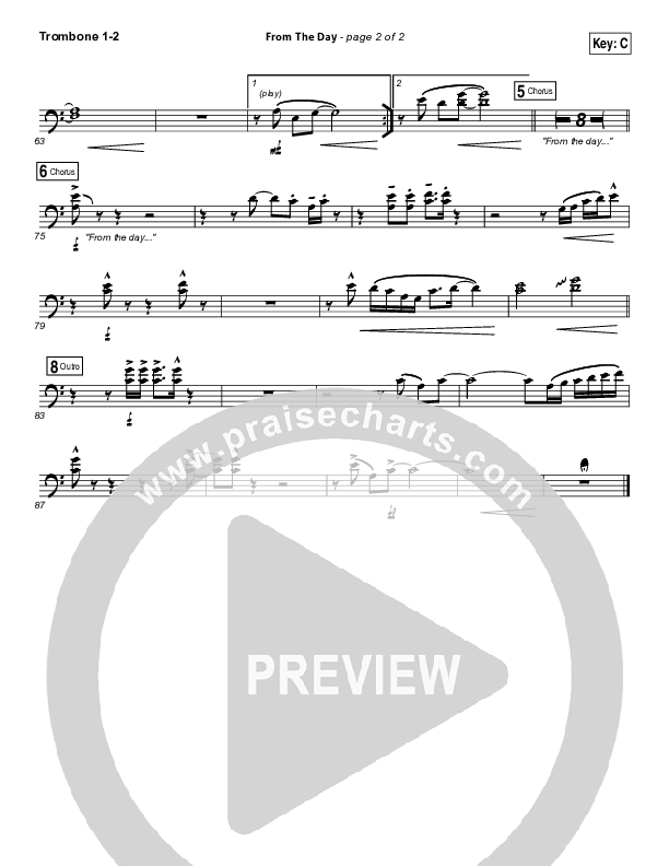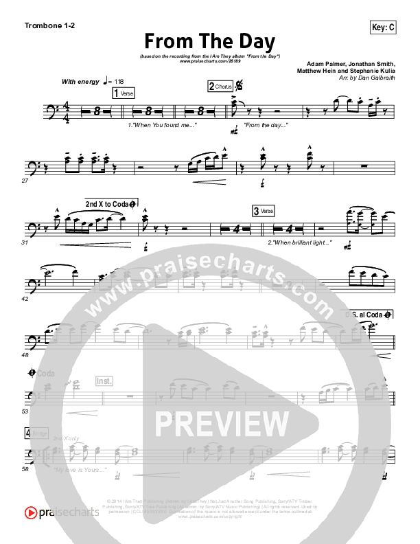 Download the Trombone 1,2 sheet music for From The Day by I Am They, from the album I Am They. This song was arranged by Daniel Galbraith / Jared Haschek in the key of A, Ab, Bb, C, D, Eb.