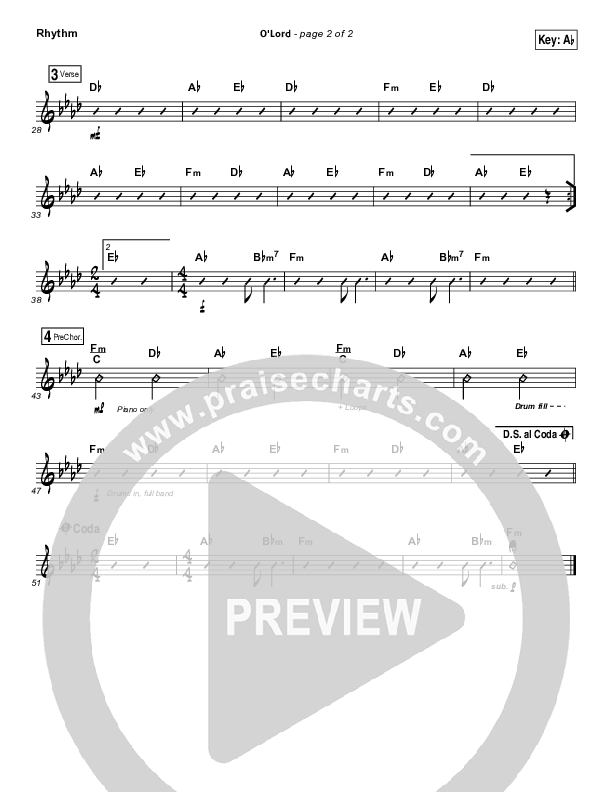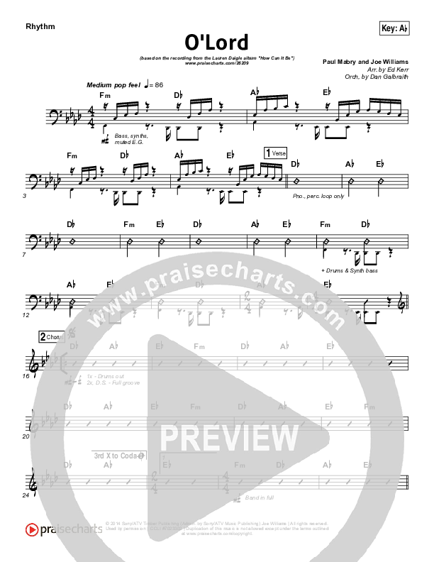 Download the Rhythm Chart for O Lord by Lauren Daigle, from the album How Can It Be. This song was arranged by Ed Kerr / Daniel Galbraith in the key of Ab, G.