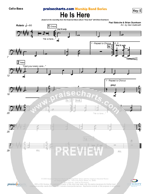 Download the Orchestration for He Is Here by Brian Doerksen, from the album Holy God. This song was arranged by Daniel Galbraith in the key of E, F.