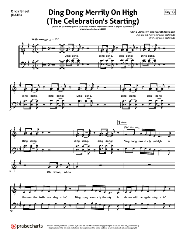 Download the Choir Sheet for Ding Dong Merrily On High by Rend Collective, from the album Campfire Christmas. This song was arranged by Ed Kerr / Daniel Galbraith in the key of F, G.